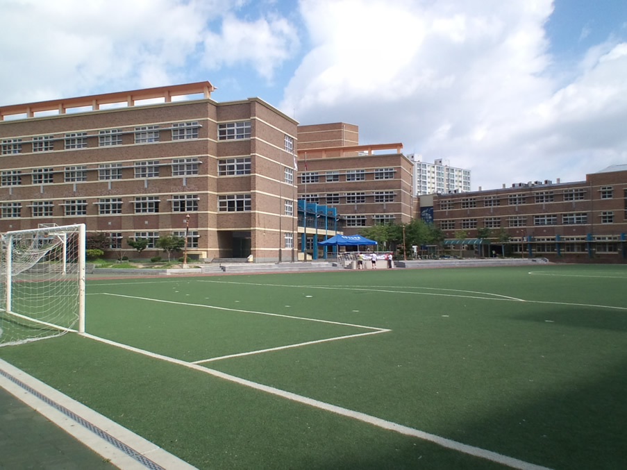 この小学校のグラウンドは人工芝でサッカーコートが実線、トラックが破線で描いてあるサッカー専用グラウンド。